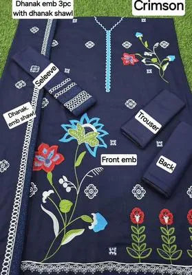 WINTER COLLECTION BRAND:MIX FABRIC DHANAK DHANAK EMB 3pc WITH DHANAK EMB DUPPATA FRONT FULL EMBROIDERED Daman patch embroidery SLEEVES FULL EMBROIDERED DYED TROUSER WITH EMB PATCH DHANAK EMBROIDERY DUPPATA Package included same as open picture Fabric and color grantee Neat embroidery grantee