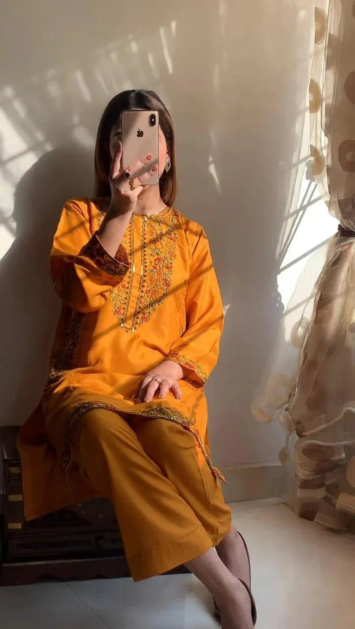 Elevate your everyday wardrobe with this stylish mustard linen shirt and trouser set. Featuring exquisite embroidery and a comfortable round neck design, this outfit is perfect for any casual occasion. Enjoy the breathable linen fabric and versatile style, making it a go-to choice. Embrace comfort and style with this 2-piece ensemble!