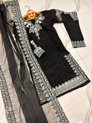 Neck,Sleeves Shirt Border With Four Sided Heavy Embroidery Dupatta 3Pcs Size Measurement Chest Size 21 Shirt Length 39/40 Shirt Stuff Organza (With Inner Attached) Embroidery Trouser Length 38 Stuff Malai Crepe Four Sided Border Embroidered Dupatta Size 2.5 Yards Stuff Organza