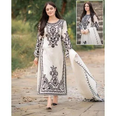 Neck,Sleeves,Daman Embroidered Shirt With Fully Embroidered Dupatta 3Pcs Size Mesurement Chest Size 20/21 Shirt Length 39/40 Shirt Stuff Organza (With Inner Attached) Trouser Length 38/39 Stuff Crepe Embroidered Dupatta Size 2.5 Yards Stuff Organza